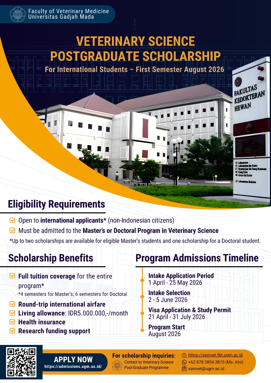 Fakultas Kedokteran Hewan Universitas Gadjah Mada menyelenggarakan prosesi pelepasan wisudawan-wisudawati pascasarjana periode III TA 2025-2026, di R. Sidang I, Lt.2, Gd V3, Fakultas Kedokteran Hewan Universitas Gadjah Mada. Acara tersebut diselenggarakan pada tanggal 21 April 2026, tepat sebelum pelaksanaan Gladi Bersih dan pembekalan Wisuda di Grha Sabha Pramana UGM. Pelepasan wisudawan-wisudawati dibuka oleh Wakil Dekan Bidang Akademik dan Kemahasiswaan Fakultas Kedokteran Hewan UGM, Prof. drh. Agung Budiyanto, M.P., Ph.D. yang kemudian dilanjutkan dengan sambutan Ketua Program Studi Magister Sains Veteriner, Prof. Dr. drh. Agustina Dwi Wijayanti, M.P., dan Prof. drh. Dwi Liliek Kusindarta, M.P., Ph.D., selaku Ketua Program Studi Doktor Sains Veteriner dilanjutkan wakil wisudawan-wisudawati yang memperoleh predikat Cumlaude.